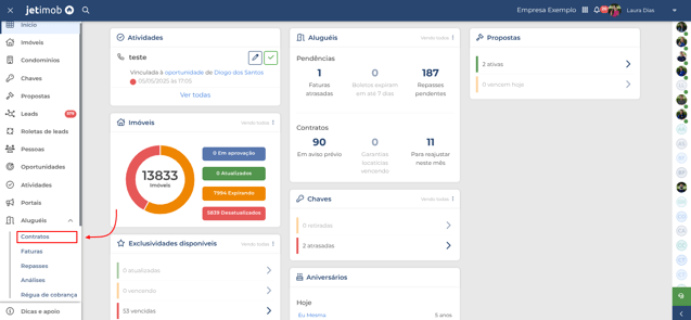 1. Acesse o módulo de ''Aluguéis'' no menu lateral do sistema e clique em ''Contratos'':