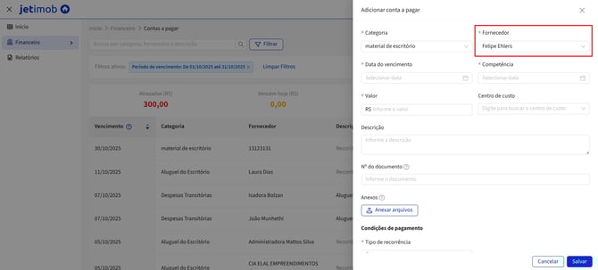 Observação: Se você buscou o fornecedor, mas ele ainda não estava cadastrado, basta clicar em "+adicionar" e cadastrar os dados da pessoa ou empresa.