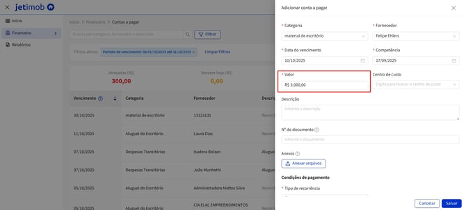 3.4. No campo "Valor", você irá preencher o valor da conta a ser recebida.