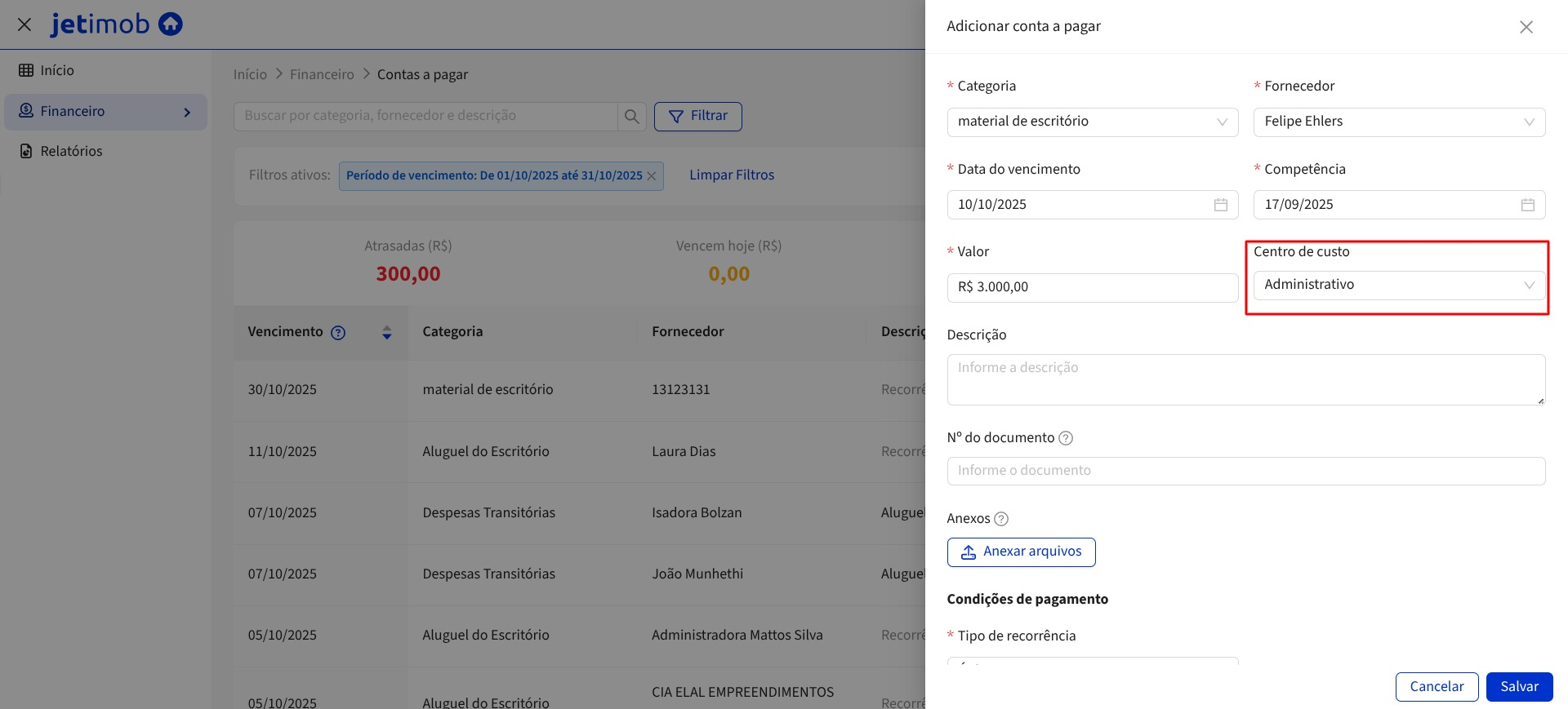 3.5. Em "Centro de custo", você irá preencher o departamento ou projeto do qual o valor virá: