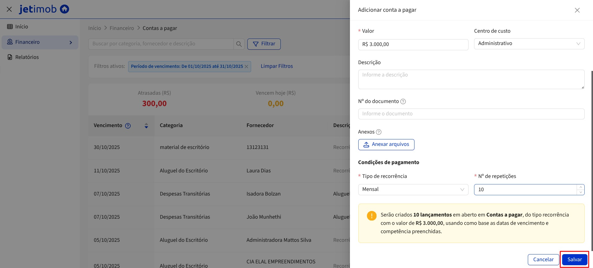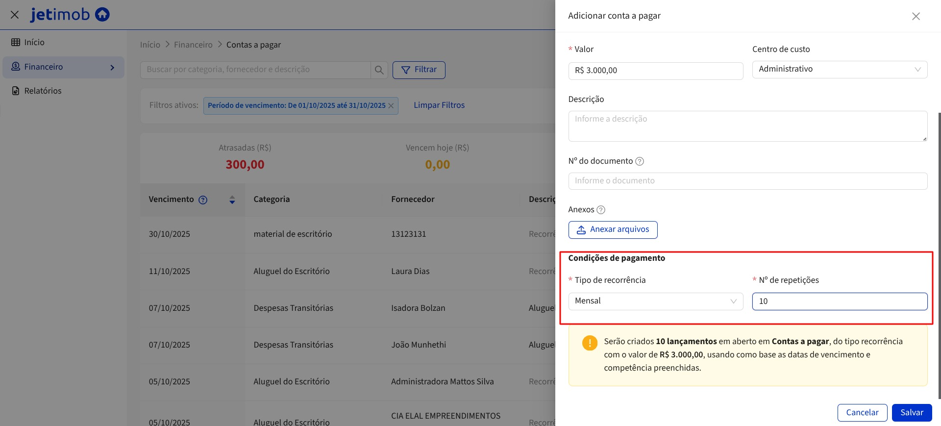 3.6. Em "Condições de pagamento" você irá definir a recorrência da conta