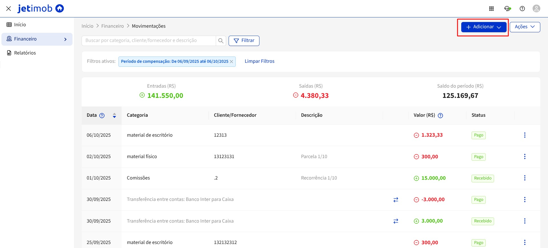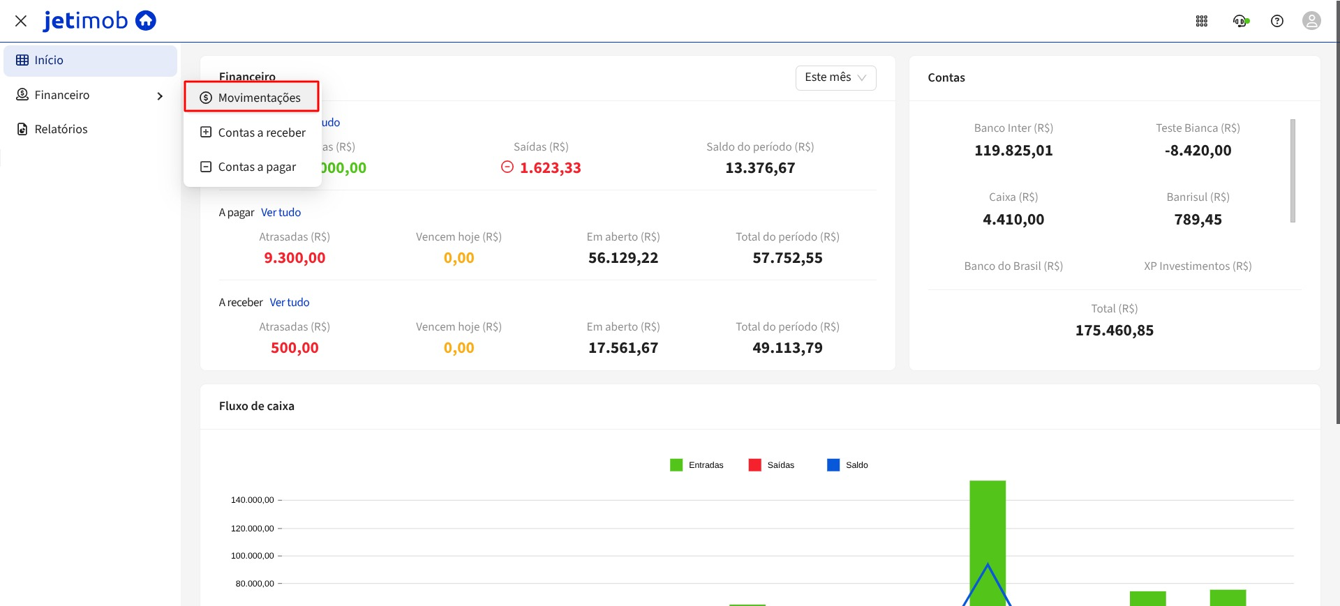 1. No menu lateral esquerdo, clique em "Financeiro", depois em "Movimentações":