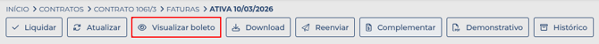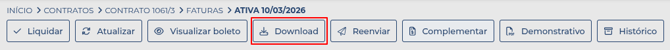 Lembre-se que o download realizado é referente ao arquivo do boleto, portanto, se o campo do download aparecer indisponível para clicar, ou seja, em cinza (como mostra a imagem abaixo) significa que foi, apenas, gerado a fatura e não o arquivo do boleto.