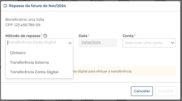 6. Selecione o “Método de repasse”.